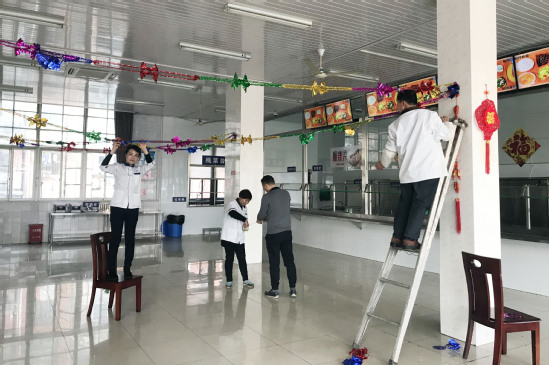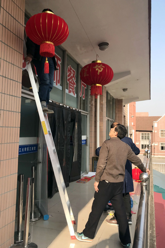 “贴上窗花、挂上灯笼,红红火火的,这样看起来才有一个过年的样子嘛,我自己也有孩子,但是留校过年的这些孩子更需要我来照顾,他们虽然留在学校过年,也要让他们有在家过年的感觉”,四公寓四号楼的宿管阿姨李玉林一边贴着窗花,一边笑着讲到。宿舍对于学生来说就是自己的第二个家,为了让留校过年的同学们也能够感受到家的温暖和过年的氛围,学校相关部门在环境氛围营造上下功夫,在学生寝室楼和食堂贴上窗花、挂上对联,在校门口和校园里挂上灯笼,给校园增加了浓浓的年味儿。