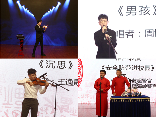 联欢会节目融合歌曲、舞蹈、语言表演、魔术、器乐等多种风格和形式,向观众绘就了一幅辉煌壮丽的光影画卷,生动展现出百十沪江园在校园文化艺术建设过程中所取得的最新成果,将现场氛围推向高潮,全体师生积极互动共同参与有趣的现场游戏,大家无不沉浸其中,而演出间歇趣味盎然的游戏和抽奖环节更是令现场欢声笑语不断。此外,长白派出所警官还精心准备了相声《安全防范进校园》,用诙谐幽默的方式科普假期安全小贴士。
