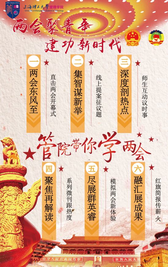 自2014年起,管理学院已连续第六年举办“管院带你学两会”系列活动,引导同学们学习两会精神,关心国家发展,营造了“全员学两会”的热烈氛围。今年管理学院将推出主题为“两会聚青年,建功新时代”学两会系列活动,包括“两会东风至”——直击两会开幕式、“集智谋新举”——线上提案征议题、“深度剖热点”——师生互动议时事、“聚焦再解读”——系列微刊跟热度、“尽展群英睿”——模拟两会新体验、“融汇展成果”——红旗简报传薪火等六大版块,组织师生深度学习两会精神。