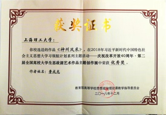 近日,由永利官网第一届“初心杯”文创作品大赛组委会报送的学生作品《神州风采》(作者为能动学院学生鲁成龙)荣获教育部高等学校思想政治理论课教学指导委员会组织的庆祝改革开放40周年·第二届全国高校大学生思政课艺术作品主题创作展“优秀奖”。