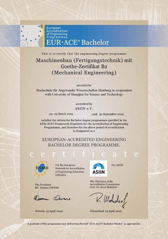 近日,永利集团304am官方入口德国合作伙伴汉堡应用技术大学(HAW Hamburg)传来喜讯,永利集团304am官方入口中德学院的电气工程技术及其自动化(中德合作)和机械设计制造及自动化(中德合作)两个专业向“欧洲工程教育认证网络协会”(ENAEE)递交的“欧洲工程师证书”(EUR-ACE)申请,于2019年4月15日正式获批,这标志着永利官网这两个专业的合格本科专业毕业生,可以获得“欧洲工程师”资质,对永利官网国际化工程教育具有重要意义。