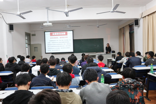 讲师团从依法治国政策、如何全面推进依法治国等方面进行了详尽的阐述。此外,授课教师还结合十九大以来依法治国取得的成绩,帮助学生充分认识建设社会主义核心价值体系的意义,提高思想道德素质和法律素质,促进全面健康成长。