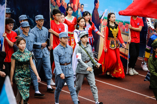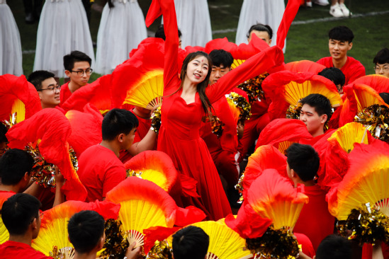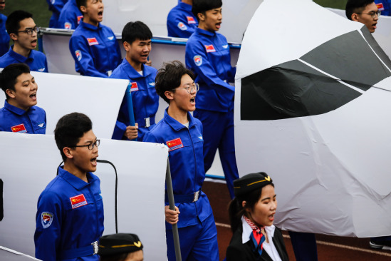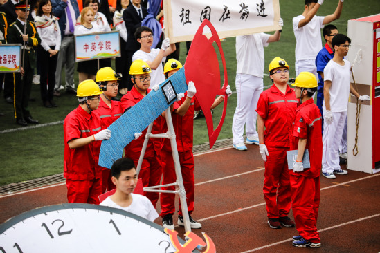 开幕式上,来自学校的19支队伍在国旗队的带领下依次走过主席台,为大家带来了别具一格的入场式表演。2019年是新中国成立70周年,各参演方阵也在开幕式中融入了诸多爱国元素:五四青年的学生装、嘉兴南湖的游船、红军战士的冲锋号等,展现了理工学子热忱的爱国心。此外各个学院也充分展现了各自的学科特色:3D打印大飞机、免疫系统的三道屏障、5G信号塔等都直观地表达了学子们对知识的热情。今年的教工韵律广播操表演和学生军体操展演也展现了永利官网师生良好的精神面貌。