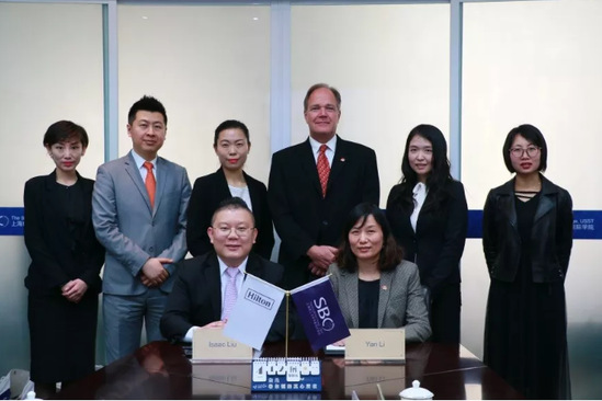 学院党总支书记李妍(前排右)与希尔顿校企合作副总监刘雷(前排左)签订校企合作协议