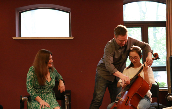 5月30日下午,Dianna Anderson及Erik Anderson还与同学们在美国文化交流中心开展了交流活动。两位音乐家对同学们的提问耐心地一一作答。Erik Anderosn在交流会上拉起大提琴,向同学们展示了大提琴的魅力。Dianna Anderson还应同学们的要求,和着大提琴低沉婉转的音色歌唱。在一片欢声笑语之中,交流会活动圆满结束。