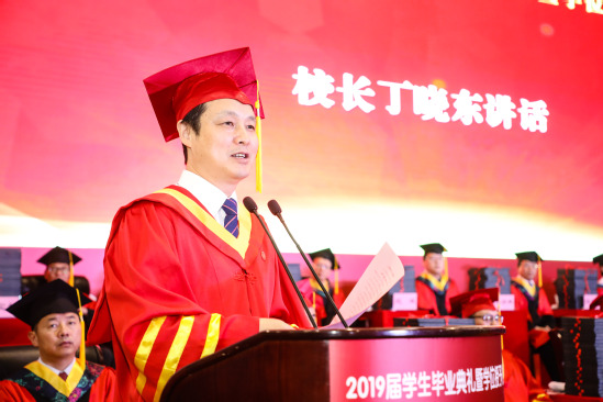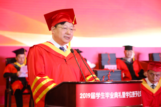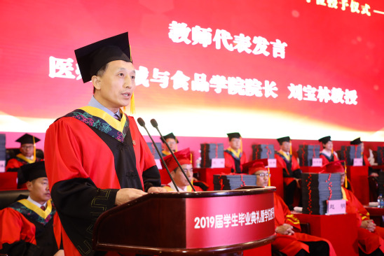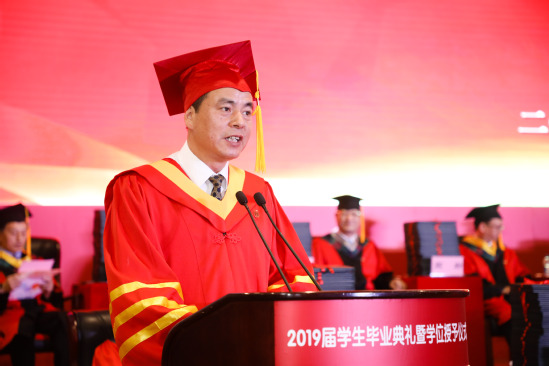 校长丁晓东作了“以青春之名,追梦前行”的讲话。他对青年学生送去了嘱托:一是以情怀和担当筑梦。1998年校友常兆华毅然回国创业、致力于高端医疗器械领域的本土化耕耘、改变国内医疗器材百分之百依赖进口的现状,这一事迹勉励毕业生们培养爱国之情、砥砺强国之志、实践报国之行。二是以激情和理想追梦。毛泽东在《湘江评论》中写道: “天下者,我们的天下;国家者,我们的国家;社会者,我们的社会。我们不说,谁说?我们不干,谁干?”,丁晓东校长以此为例,勉励毕业生要以自信人生的朝气与锐气、笑对风云的淡然与怡然、追逐梦想的信心与决心,不断积蓄起干事创业的强大精神力量,乐观、坚强、勇毅地阔步前行。三是以奋斗和奉献圆梦。丁晓东校长分享了医食学院优秀毕业生游国鹏放弃了读研和就业,选择支援西藏的事迹,并勉励同学们,无论身处何方、从事什么职业,请以奋斗作为实现梦想的“不二”途径,用奉献找到人生的正确打开方式。