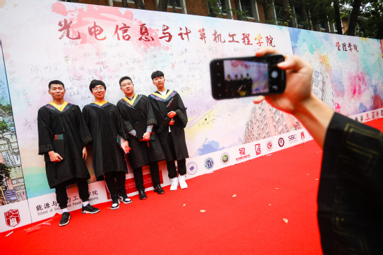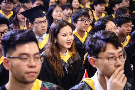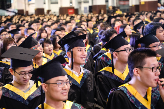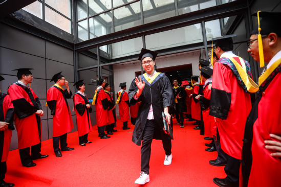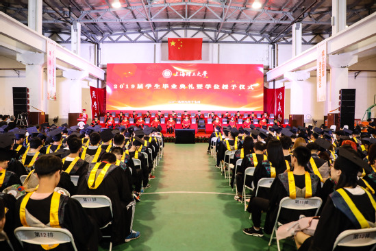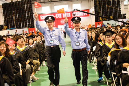 随着音乐声起,陪伴学生四年的“上理家长”——毕业班辅导员、保卫处、后勤处的教职员工们在阵阵掌声中入场,奏响了毕业典礼的序曲。随后,“尚理之歌——永利集团304am官方入口2019届学生毕业留念”专题片如期“上映”,毕业学子们大学四年的片段快速穿梭,拉开了毕业典礼的序幕。