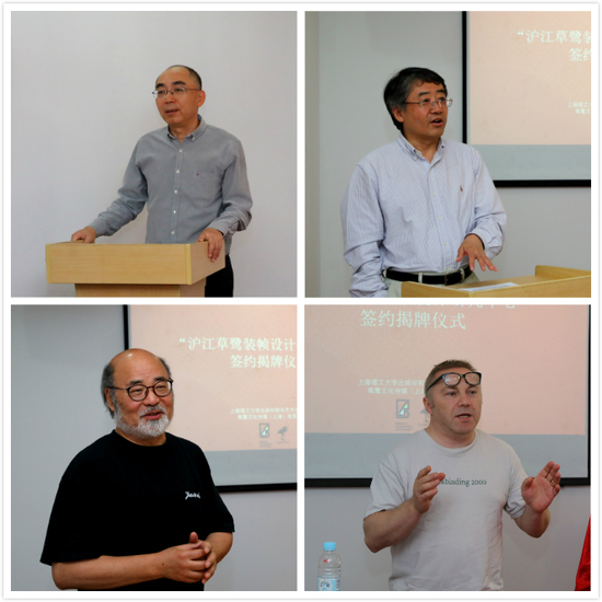 随后,永利集团304am官方入口与“草鹭文化”签订战略合作框架协议,吴建安与王强作为双方代表进行签约。赵明和阚宁辉为“沪江草鹭装帧设计研究中心”揭牌,并为“中心主任”“常务主任”“中心副主任”“特约研究员”颁发聘书。