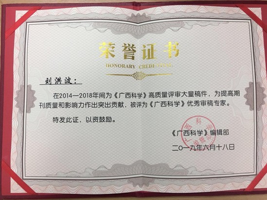 2019年6月18日,《广西科学》杂志编辑部为近年来的优秀审稿专家授予荣誉证书,环建学院刘洪波老师被评为2014-2018年度《广西科学》杂志的优秀审稿人。