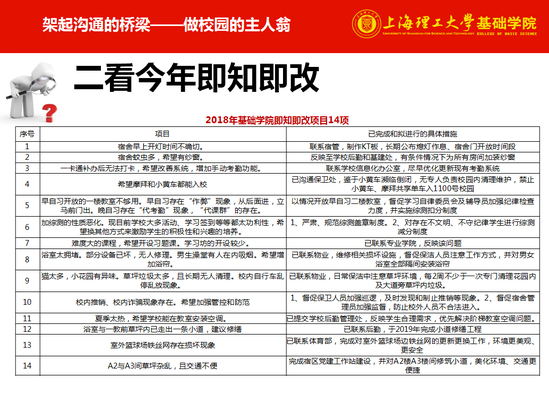 2013-2014年基础学院落实即知即改项目13个,2015年落实即知即改项目8项,2016年重点针对学风问题落实即知即改项目8项,2017年完成即知即改项目21项,2018年落实即知即改项目14项。学院施行即知即改项目以来,在全校各职能部门的积极协调和配合下,服务师生的效果显著。学院充分关注新形势下师生的新需求,工作实现“三贴近”,即贴近专任教师、贴近青年教师、贴近学院学生,增强针对性和实效性。