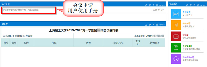 进入会议申请模块后,在会议公告区域可直接在线浏览会议申请用户使用手册,如图所示: