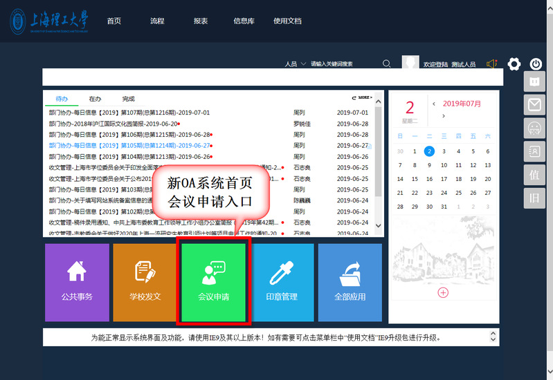 经过2019年上半年的努力,新OA系统中最大的功能模块——会议申请模块在6月底终于完成建设和测试,将于7月8日在全校范围内启动使用。