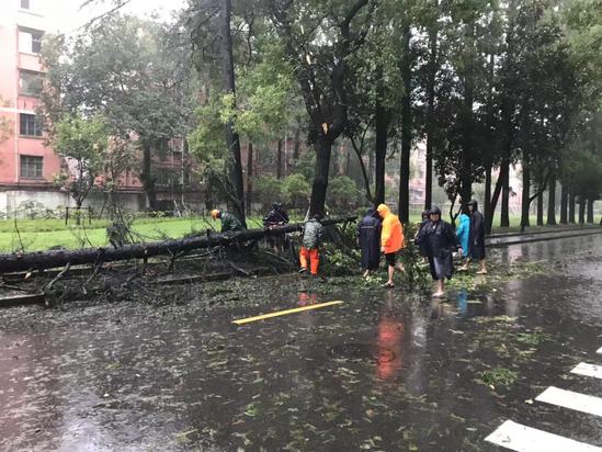 在后勤管理处设置值班室,生乐物业、东方大学城物业经理24小时在岗值班,后勤应急抢险人员随时待命。值班人员分校区、分区域每2小时对校园巡视一次。及时处置倾倒树木6株,扶正桂花、海棠等树木12棵,清扫道路,疏通雨水井。安排400余名施工工人到第四教学楼、体育活动中心临时休息,确保施工人员安全。