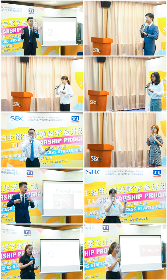 T1精英计划启航训练营历时一周,期间组织了企业参观、学长辅导等活动。为期一周的高强度学习,T1学员们在项目的策划和执行、学术英文能力、英文演讲技能等方面都得到了专业和系统的指导,在一次次的锻炼中得以更加自如地陈述和总结自己的观点。学术老师和T1学长们也从专业介绍、校园生活、社团活动等方面为新生提供了详细的咨询和建议,帮助各位同学能够更快、更好地成长。