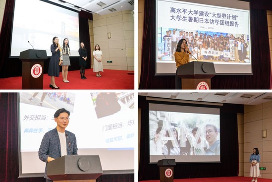 报告会的第一部分是师生交流环节,赴俄罗斯拉阻尼国际夏令营、赴英国考文垂大学交流项目、赴日本的开拓学生国际视野项目和学生领导力提升——高水平大学建设“大世界”项目共四个交流团组的学生代表依次上台作总结报告,学生们用精彩的视频和动人的演说向全校师生们分享行程中的经历。暑期交流包括实践课程、实验室参观、分组研讨会、名企参观、城市观光和文化交流等环节,从视频中大家脸上洋溢的笑容里可以感受到此次行程对每个人来说都是一段难忘的经历。随后,带队老师们上台分享心得,他们分别用“神奇”、“收获”、“自豪”形容了此次行程。团组们在各类课程项目、文化互动环节的卓越表现,令外国朋友眼前一亮,他们在国际舞台上展现的蓬勃朝气和优秀的综合素质,展示了当代中国青年积极向上的精神风貌。