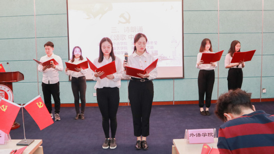 接着,与会人员观看纪录片《我们走在大路上》(节选),以小组为单位进行研讨交流并上台分享总结。随后,由能动学院、版艺学院和外语学院的6名研究生党员为大家带来精彩的诗朗诵《颂歌·中国》,礼赞我们所处的伟大时代和可爱、可亲、可敬的祖国。