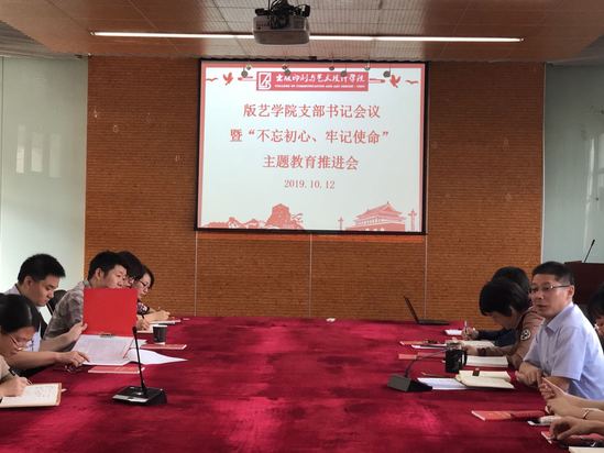 版印初心,艺心向党,为进一步贯彻落实学校党委的工作部署和要求,10月12日,版艺学院党委在综合楼A508室结合“三全育人守初心”“立德树人担使命”,召开“不忘初心、牢记使命”主题教育推进会。学院党委书记吴建安、副书记尚娅、全体学生支部书记、教工支部书记出席会议。
