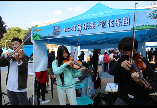 中午,社团们纷纷在舞台上献上各自精彩绝伦的展示。情景体验互动等模式有效地把社团与同学们结合起来,使同学们更加切身体验社团文化节的特色与各个社团的风采,并被真正带动参与到“表白祖国”的系列活动之中。在个人演出环节,两位外国友人被现场气氛所感染,倾情献唱,并在背景墙前留下照片纪念;心系祖国的上理学子们还为祖国献上了他们的土味情话“我有一个超能力,超级喜欢你”或是在气球上贴上对祖国的祝福;书法社的宣传台上,一纸笔墨矫若游龙、力透纸背;在一片较为空旷的场地上,滑板社员翻飞着脚下花样,一个腾空干脆利落;在场地的另一边,汉服社几位翩翩起舞的女同学体态轻盈,通过优美规范的舞蹈宣扬传统文化。