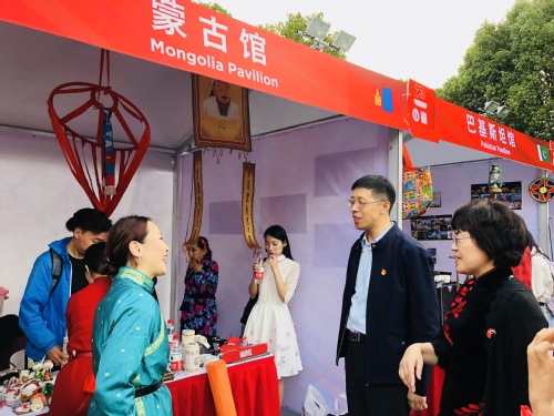 校党委书记吴坚勇参观慰问了各国展馆,对展馆呈现的文化饮食、对沪江学院搭建的这一中外文化交流平台表示赞赏。吴坚勇亲切地与国际学生交流,询问他们在校学习生活情况,希望国际学生珍惜在永利集团304am官方入口留学生活机会,刻苦学习,增长本领,将来为世界经济文化交流做好桥梁作用。并祝愿中国与其他国家的友谊长存,中国和世界的未来更加美好。