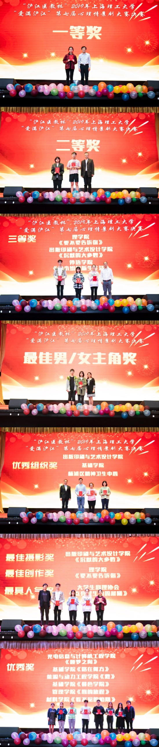校园心理情景剧以大学生喜好的舞台剧形式,结合心理剧的技术,将大学生生活中常见的心理困惑搬上舞台,帮助同学们感悟生活,学习心理调适方法,提高大学生的适应能力。本次大赛自9月份启动以来,共有12组剧目进入初赛。经过剧本编写、心理剧技术、舞台表演三轮主题培训,网络投票和专家评审环节,有3组剧目晋级决赛。最终,大学生心理协会《点亮我生命的晨曦》获得一等奖、基础学院《夏天》和机械工程学院《看不见的手》获得二等奖。出版印刷与艺术设计学院、基础学院、杨浦区精神卫生中心获得优秀组织奖。