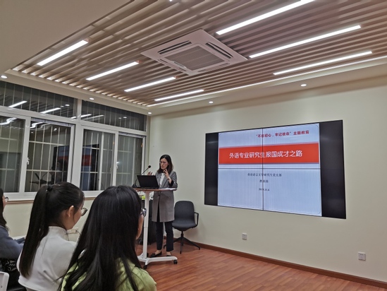 为深入开展“不忘初心、牢记使命”主题教育,2019年11月6日晚,外语学院英语语言文学研究生党支部在学院112党建服务站开展专题党课学习,党课主题为“外语专业大学生的成才之路”,本次党课由外语学院党委书记程旺、党支部书记瞿莉莉共同主讲。