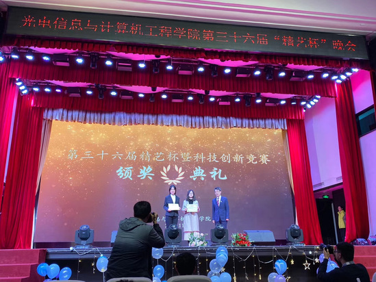 《咏春》以优美的古风乐曲、华美的画面和轻柔的舞步拉开了晚会的帷幕。随后陈海瑾为晚会致辞,她讲述了在光电学院发展中的亲身感受,总结了这一年来光电学院的丰硕成就,并为全体光电学子送上了衷心祝愿。在播放了光电学子在各类科技竞赛中的照片集锦后,随即进行光电新能力杯、明佳昕仁杯及光电学院第一届“院长奖”的颁奖典礼,嘉宾们为在各个赛场上斩获颇丰的获奖者颁发了获奖证书,并鼓励同学们能够更加重视对科创能力的培养。
