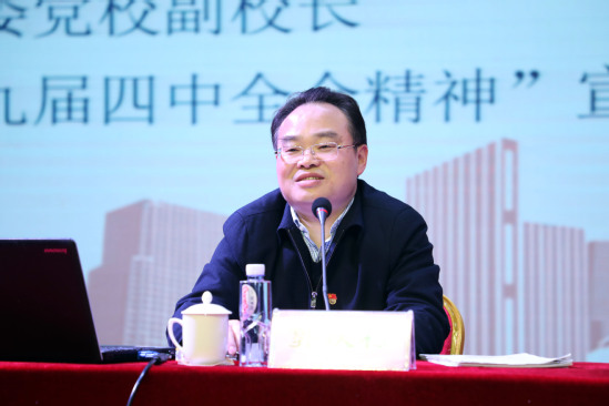 吴坚勇在总结讲话中指出,郭庆松教授的辅导报告对我们进一步贯彻落实四中全会精神具有非常好的指导作用。就下一步如何更好地学习贯彻四中全会精神,他提出两点要求,一是深入学习贯彻四中全会精神,务求做到学懂弄通悟透做实。高校是教书育人的重要场所,各级领导干部要切实增强“四个意识”、坚定“四个自信”、做到“两个维护”,将学习贯彻四中全会精神融会贯通到“三全育人”各个环节,引导广大师生形成对社会主义制度优势的内心认同,进一步增强思想自觉、行动自觉,进一步坚定中国特色社会主义制度自信。二是将学习贯彻四中全会精神与学校中心工作结合起来。四中全会提出要坚持和完善中国特色社会主义制度、推进国家治理体系和治理能力现代化。高校不仅面临着加快推进学校治理体系和治理能力现代化的重要任务,同时也面临着系统、整体、协同推进高等教育综合改革的时代命题。要把学习贯彻四中全会精神与开展“不忘初心、牢记使命”主题教育相结合、与全面推进依法治校相结合,要重点抓好制度建设,特别是做好正在开展的校院两级规章制度“废改立”工作。通过不断提升学校治理体系和治理能力现代化水平,为高水平大学跨越式发展提供坚强支撑。