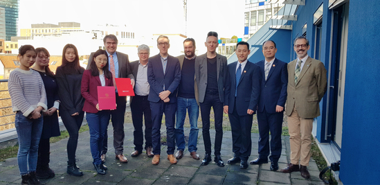 代表团最后一站来到德国欧洲应用科技大学。欧洲应用科技大学是由劳瑞德集团旗下德国商业与信息技术大学和德国柏林工程艺术大学两所高校于2017年合并而成。该校校董事会成员、艺术设计学院负责人、创新设计管理项目负责人以及国际交流事务项目负责人等热情接待了代表团一行。双方就交叉学科发展合作、学生交流交换及联合培养等进行了商讨,达成进一步合作的共识,双方签署合作协议。代表团一行参观了该校创新设计教学和实验室场所,并与永利官网在欧洲应用科技大学交流的3名学生座谈,了解了学生们在德国的学习与生活情况。学生们表示非常感谢学校提供的交流平台,同时也对项目的进一步发展提出了优化建议。