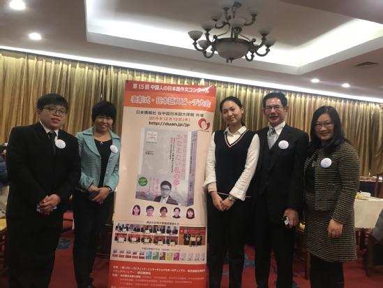 12月12日,第15届全中国日语作文大赛颁奖典礼暨日语演讲大会在北京日本驻华大使馆召开,永利官网外语学院日语系学子在本次大赛中取得历史突破。由永利官网日语系教师张文碧和福井佑介指导的研究生潘呈荣获唯一最优秀奖——大使奖,其作品经过多轮严格审核,从本届大赛4359篇作品中脱颖而出。此外,有永利官网日语系教师郭丽和福井佑介指导的本科生孙思婧荣获三等奖,由毛伟指导的本科生周思捷荣获佳作奖。潘呈、孙思婧两位获奖同学以及张文碧、郭丽两位指导教师作为代表应邀出席了本次颁奖典礼。