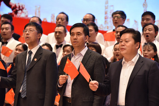 上海市教卫工作党委副书记、工会主席滕建勇讲话。他指出,新中国成立70年来,中华儿女盎然奋进,一往无前。谱写了一曲又一曲波澜壮阔、浓墨重彩的壮丽篇章;70年来,上海高校面对机遇与挑战,高等教育跃上新的台阶,成绩斐然。本次合唱展演用歌声赞美了祖国70来取得的辉煌成就,讴歌老一辈无产阶级革命家英勇顽强的献身精神和国家的繁荣昌盛,同时也是上海市高校教师风采的完美展示,教师们用嘹亮的歌声,唱出了园丁们的奉献精神,唱出了对教育事业的执着初心,唱出了所有教育工作者的豪情与梦想。他希望教师们能不忘初心、牢记使命,用歌声唱出新时代的风采。