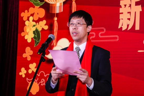 校党委书记吴坚勇代表学校致新春贺词。他首先向各级领导、合作单位、离退休老领导、老同志、海内外校友以及长期以来关心支持学校发展的各界朋友,向团结奋斗的全校师生员工表示衷心的感谢和美好的祝福。他指出,过去的一年,学校以习近平新时代中国特色社会主义思想为指导,深入开展“不忘初心、牢记使命”主题教育,全面加强党的领导,始终坚持立德树人根本任务,不断推进“三全育人”综合改革。全校师生团结一心、锐意进取、爬坡跨坎、努力拼搏,在前进的道路上奋力奔跑,共同凝聚起了创建特色显著的一流理工科大学的上理智慧和力量。吴坚勇强调,2020年是具有里程碑意义的一年,学校高水平大学建设将迎来第一轮收获。全体上理人要坚定“为党育人、为国育才”的初心使命,只争朝夕、不懈奋斗、攻坚克难、善作善成;要在学校的事业发展中感受到家的温暖,让自己工作更安心、生活更舒心、对未来更有信心。随后,吴坚勇携全体校领导向所有来宾、全校师生、海内外校友、各界朋友拜年,向大家致以诚挚的新春祝福。
