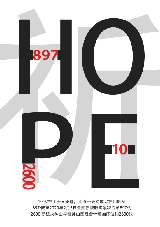 作品展现了基建队伍在这场战疫中的力量。灵感源于10天建成的火神山医院,挖掘机在土地上留下一道道与时间为敌的痕迹。挖掘机留下的痕迹形成战疫二字,表达了在这场战疫中,基建队逆行者奉献的巨大力量。战疫是战胜疫情的缩写,这场战疫终将胜利!
