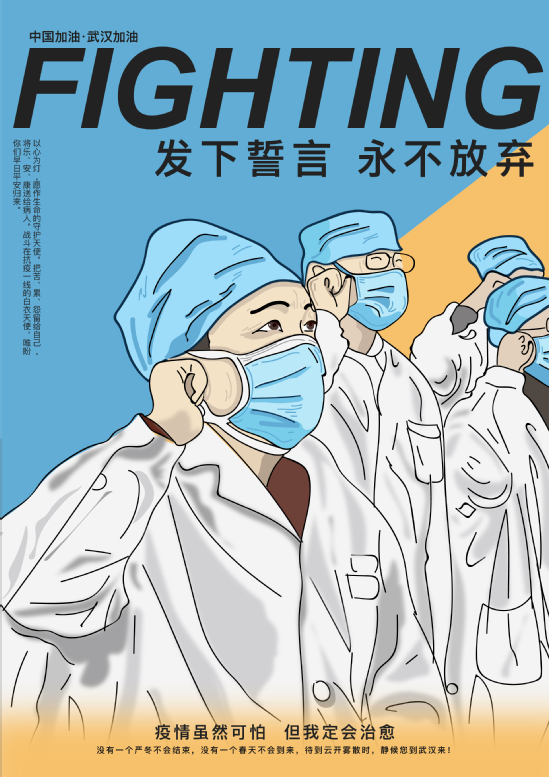 这是一组系列海报,第一幅是医生宣誓的画面,面对疫情,她们不退缩,不低头。她们脚下有土地,心中有信仰。坚定的眼神和宣誓的手体现的是她们和疫情斗争的信心,同时也体现了千千万万的中华儿女对这次疫情的抵抗。