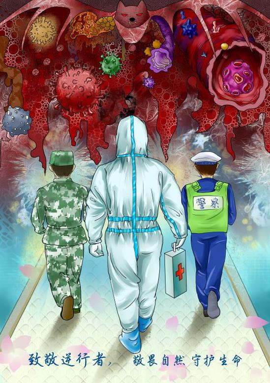 “所谓白衣天使,不过是一群孩子,换了身衣服,学着前辈的样子,和死神抢人。真的辛苦了!向白衣天使致敬!”有感而画。主体是逆行的白衣天使,粉色字体和装饰源于武汉的樱花。