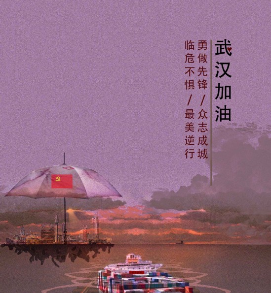 武汉别称“江城”,傍水而生。图中为武汉的地标性建筑集群。“孤岛”表明此时武汉为封城的状态,但隔离病毒不隔离爱。带有中国共产党党徽和红十字标记的保护伞屹立于城市上空,寓意贯彻落实党中央决策部署,在一线的医护人员的守护与坚守下,我们将取得最终的胜利。海洋上航行的是各地支援武汉运输物资的船舶,众志成城共渡难关。曙光突破乌云照射在城空意味着疫情会得到控制。