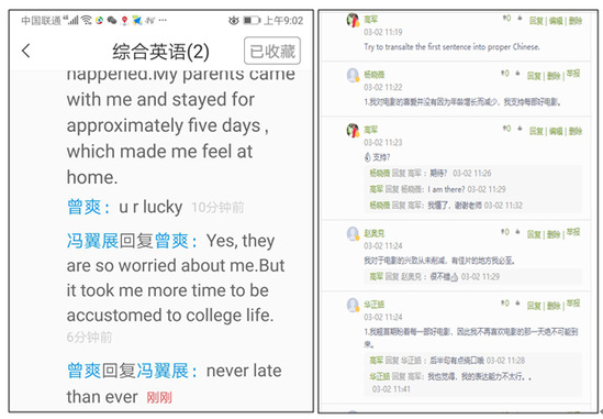 英语中美合作专业教师曾姝:和正常课堂发言相比,网上讨论更为热烈,每个学生都愿意分享自己的观点并用英语表述出来。这让我意识到,中国学生在英语课上比较沉默,不是没有观点或不愿意发表观点,更不是没有能力用英语表述出来,而是对speaking(说)有所顾忌,作为英语老师要好好研究怎么给学生创造一个开口说英语的轻松氛围,这可能比讲语法和专业知识更为重要。