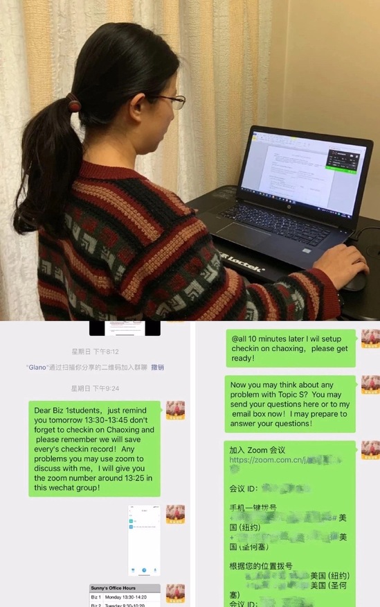 Sunny GUO老师说,“历经一个月的钻研,现在我不仅可以熟练操作在线教学平台,还可以每天在各种平台上‘穿梭’自如!”她希望同学们继续保持良好的学习状态,提升在线学习效率,她还在微信群里提醒学生,如遇到不懂的问题可以随时提问。