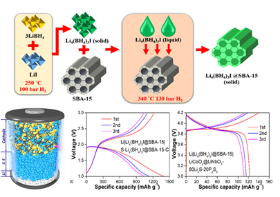 在高容量电极材料研究方面,团队巧妙地运用了固相预锂化策略构建出新型的金属锂配位氢化物Li-Al-H体系纳米复合电极材料,并以Li-B-H体系固体电解质组装全固态锂电池,显现出优异的电化学性能。该工作发表于材料领域权威期刊Advanced Energy Materials(2020,1902795,IF: 24.884), 题为:Solid-State Prelithiation Enables High-Performance Li-Al-H Anode for Solid-State Batteries 。