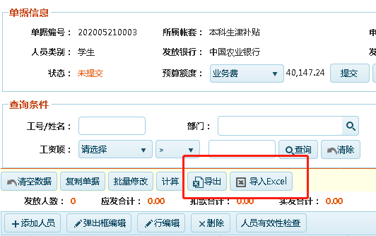 (3)导出模板编辑后,导入数据。注意:学号文本格式,金额数值格式,未发放单元格全填零。