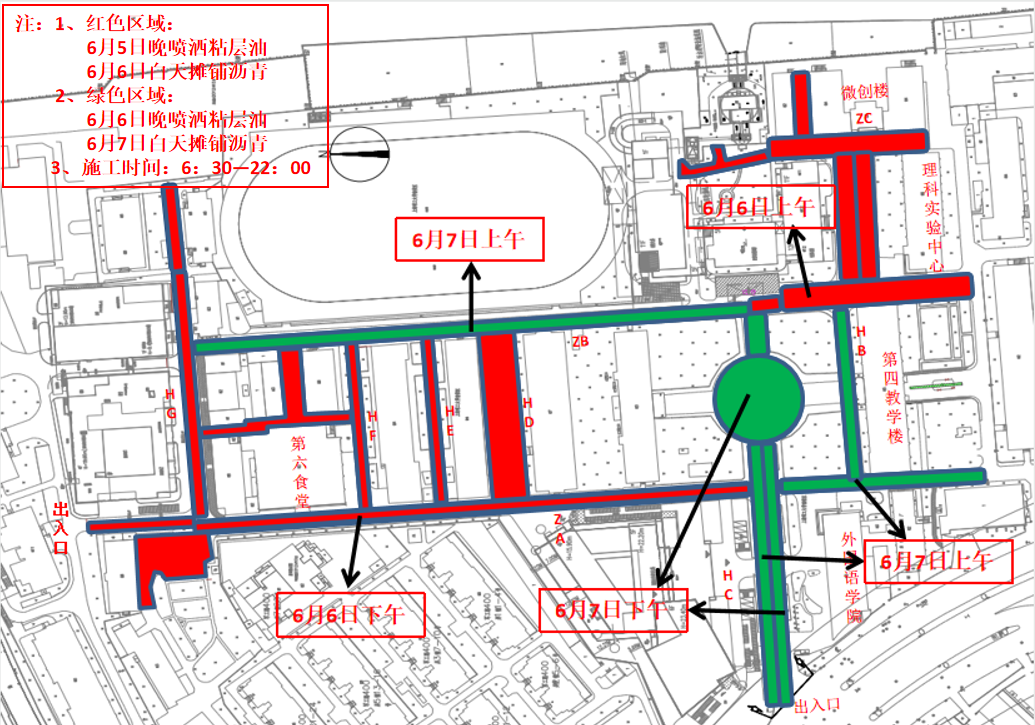 永利官网南校区道路将于2020年6月6日、7日(周六、周日)进行细沥青铺设施工,6月5日晚20:00-22:00进行摊铺沥青油工作,6日、7日施工时间段为早6:30至晚22:00,施工分为两个阶段,见附图。施工范围为南校区尚文路以南的全部道路,包括诚信大道、海学南路、海志南路、管理学院南侧停车场。