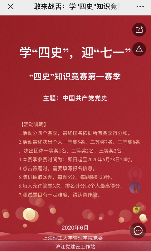 中国人民抗日战争的起点是哪次事件?我国的改革开放由哪次会议揭开了序幕?哪次会议确定了“三步走”发展战略?……100道极简党史题拉开了管理学院线上知识竞赛的序幕,赛事采取支部和个人分类竞赛的形式,之后还将分主题设立党史、新中国史、改革开放史、社会主义发展史赛季,以期在检验“四史”学习效果的同时营造人人竞学的氛围,形成“久久学、绵绵悟、常常赛”的长效学习机制。