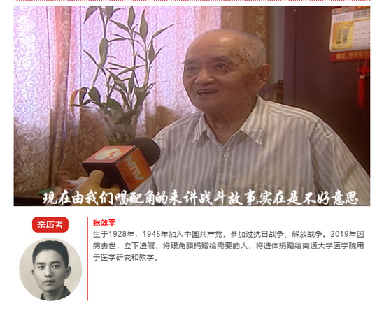 “现在由我们唱配角的来讲战斗故事,实在是不好意思。”参加过抗日战争、解放战争的张效平在视频里谦虚地说道。这位“四史”亲历者是管理学院辅导员张丽佳老师的爷爷,遗憾的是老人已经去世。为了能让更多的师生听到抗战老兵真实的声音,张丽佳将爷爷接受采访的珍贵视频提供给了沪江党建云平台,让师生们能够亲身感受“四史”的温度与力量。“这是学院《e位见证,‘四史’亲历者说》的第一期,学院还在不断发动师生们寻找身边的‘四史’见证人,通过他们讲述亲历故事,增强学习的感染力。”管理学院党委书记汪维谈道。