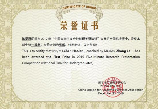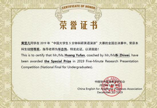 永利官网大学英语竞赛团队从去年6月开始积极备赛,在全校范围内遴选人才、组建参赛队伍。外语学院公共英语教研中心张乐副教授和毕志伟副教授从学术写作、演讲语言、仪态、视频制作等各方面精心指导。最终,来自管理学院2018级学生黄昱凡和陈昊澜分别荣获本科生组全国特等奖和一等奖,另有两名同学获得二等奖。张乐和毕志伟荣获“优秀指导教师”奖。