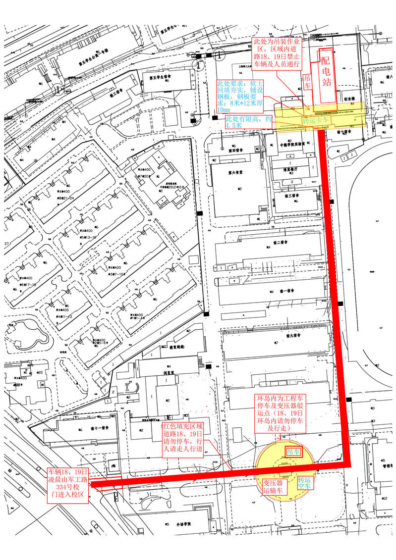 在此期间,设备运输路线涉及道路不方便停车(红色部分),行人请走人行道。吊装作业范围封闭(黄色部分),人员及车辆均无法通行。烦请开车的老师和毕业生离校的车辆避开行进路线停放,人员及车辆避让作业封闭区。施工期间给学校师生出行带来不便,敬请谅解。