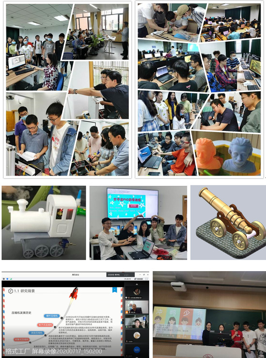 在近六天的小班实践活动中,能动学院分别开设了1个项目研究与创新设计班、1个行业情报研究及创新方向分析班、1个装置创新设计与制作班、3个三维绘图创新技能训练班、4个PLC控制创新技能训练班,分别由王子龙、王刚、王莹、王佳韵、张良、盛健、陈家星等10位实践教学经验丰富的教师执教。如执教“项目研究与创新设计班”的刘敦禹副教授,以基于云端控制垃圾智能分类及回收系统设计、嵌入式自动洗碗机节水设计等6个创新项目为背景,通过创新立项书、专利交底书、创业计划书的编制,进行了全流程的创新创业教学实践。又如执教“装置创新设计与制作班”的高明副教授,以能动学院60周年院庆创意作品制作、太阳能灭蚊灯等6个课题,完成了6项制作,其中,在3D打印的蒸汽机车头里植入超声雾化装置产生蒸汽,寓意能动学院60年的引擎作用和期望今后发展蒸蒸日上,让人印象深刻。另外,由于疫情原因,有12名身处湖北、黑龙江、辽宁的同学不能返校,因此在本次实践活动中将他们全部编入到“行业情报研究及创新方向分析班”,通过“腾讯会议”平台、“智慧教室直录播云平台”为他们专门开设了线上课程,由章立新教授执教,该班将在校学生和在家学生混编分为6个组,以翻转课堂的形式,针对泵、风机等6个通用机械的小行业,利用标准网、专利网、知网、行业协会网站了解行业动态,使用Endnote软件进行文献管理,通过对标准、专利、论文的分析和对行业协会的了解,研究行业的国内外现状及发展趋势,找优势、找差距、找卡脖子点,挖掘创新方向,从中还植入了课程思政元素。