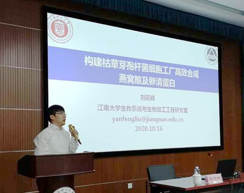 随后,刘延峰作“构建枯草芽孢杆菌细胞工厂高效合成燕窝酸及卵清蛋白”的研究报告,此研究解决了枯草芽孢杆菌合成途径限速步骤鉴定难、基因表达调控工具不足和细胞流量分配调控效率低等难题,报告内容的前沿性与新颖性吸引了生物相关专业师生的关注。报告结束后刘延峰研究员同与会师生进行了深入探讨交流。