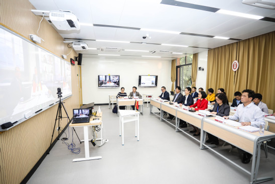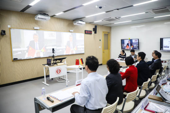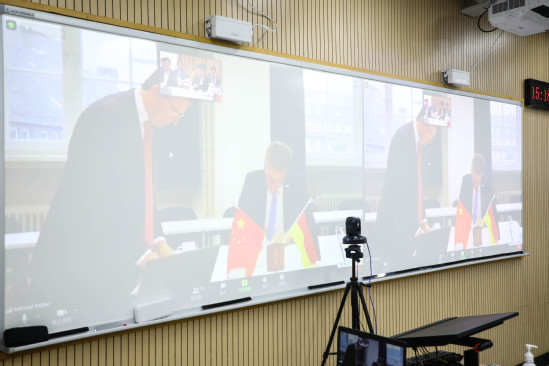 丁晓东主持召开了中德国际学院2020年度联合管理委员会会议。汉堡应用技术大学胡特教授(M. Röther)、富特旺根应用技术大学郝赫教授(M. Hoch),科堡应用技术与艺术大学维克教授(M. Wick)和雷根斯堡东巴伐利亚工业大学席莱内尔(R. Schreiner)教授在德国通过视频参加了会议。