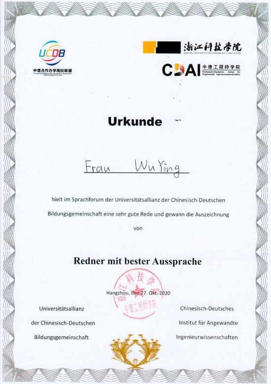 本次演讲比赛的主题是“新冠疫情下人与自然的关系及人生感悟”,各个高校的学生代表采用自命题的形式参加了比赛。永利集团304am官方入口中德国际学院2018级国际经济与贸易(中德合作)专业学生吴颖以《消除对自然的敌意》为题参加了交流比赛,指导教师张冰和苗朋朋在赛前对其在专业和演讲技巧方面做了充分的培训。在比赛中,吴颖同学以流利的德语表达、语音语调和专业的演讲台风,打动了专业德语老师们组成的评委小组,最终斩获大赛的“最佳语音语调奖”。