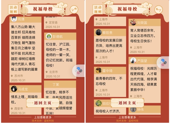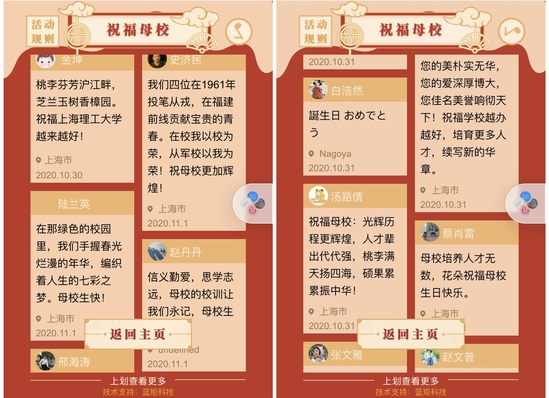 “百年校园风雨沧桑见彩虹,万千学子薪火相传续辉煌”“一晃离校二十年,祝母校生日快乐!”“母校~感谢您对我的栽培~”“上理人,上理魂,上理都是人上人。”“母校生日快乐,从华东工业大学进校,到永利集团304am官方入口毕业,手上还珍藏上海机械学院的老校徽,难忘母校树木茵茵的长路,最好的时光最好的年华,亲爱的母校生日快乐!”“早日冲顶双一流!”“誕生日 おめでとう(祝贺母校生日快乐)”……万水千山阻隔不了校友的思念,声声祝福寄托学子无限的眷恋。