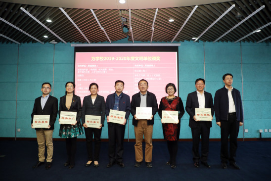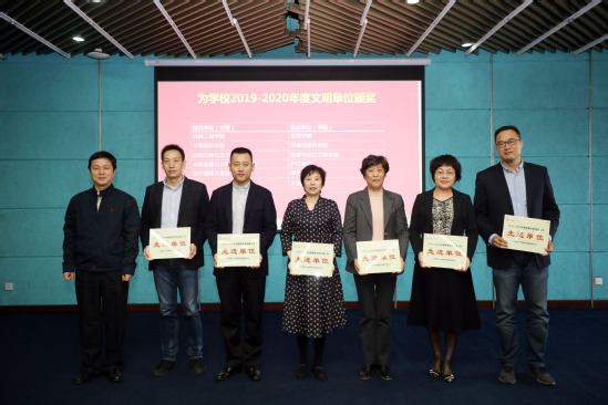 会议对2019-2020年度学校文明创建标兵单位和先进单位、市校两级社会主义精神文明好人好事、文化建设优秀项目和学习强国优秀组织奖等进行了表彰。医食学院、外语学院、教务处和后勤管理处负责人分别以《解码高质量发展的医食精神》《依托文明创建 推进事业发展》《以师生为本 建文明教务 助推学校事业高质量发展》《创文明,树新风,引领校园新时尚》作了交流发言。宣传部负责人结合学校实际情况,就做好迎评工作作了动员和任务布置。